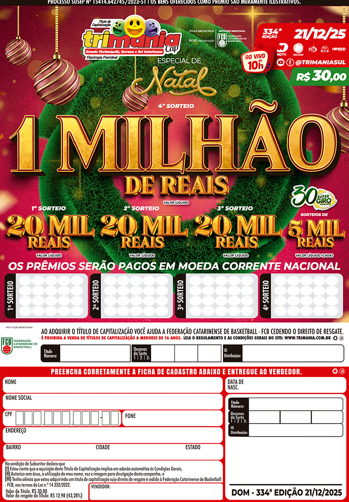 “Sorteios decorrentes de Títulos de Capitalização de Pagamento Único, da Modalidade Filantropia Premiável, emitidos pela KOVR Capitalização S.A., inscrita no CNPJ sob nº 93.202.448/0001-79 e aprovados pela SUSEP. Você pode ajudar a Federação Catarinense de Basketball, comprando o Trimania Cap e cedendo o direito de resgate. A aprovação deste Título pela SUSEP não implica, por parte da Autarquia, em incentivo ou recomendação a sua aquisição, representando exclusivamente, sua adequação às normas em vigor. Antes de contratar, consulte previamente as Condições Gerais.””PROIBIDA A VENDA PARA MENORES DE 16 ANOS””Você pode ajudar a FEDERAÇÃO CATARINENSE DE BASKETBALL, comprando o Trimania Cap e cedendo o direito de resgate.”“O SC CAP ASSESSORIA E PROMOÇÃO DE VENDAS LTDA, como intermediário deste Título de Capitalização, está sujeito ao cumprimento integral das disposições contidas na Resolução CNSP nº 382/2020, inclusive quanto à prévia disponibilização ao proponente das informações previstas no art. 4º, § 1º da referida Resolução. Para dúvidas ou maiores informações, entre em contato conosco através do e-mail controles.internos@kovr.com.br”