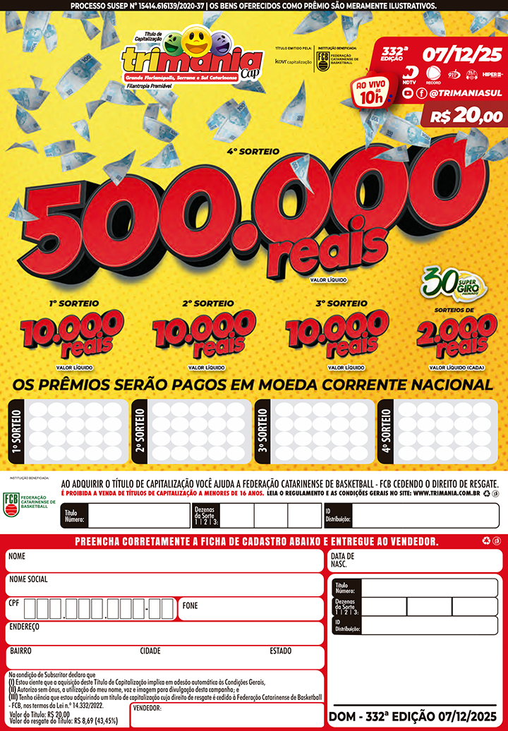 “Sorteios decorrentes de Títulos de Capitalização de Pagamento Único, da Modalidade Filantropia Premiável, emitidos pela KOVR Capitalização S.A., inscrita no CNPJ sob nº 93.202.448/0001-79 e aprovados pela SUSEP. Você pode ajudar a Federação Catarinense de Basketball, comprando o Trimania Cap e cedendo o direito de resgate. A aprovação deste Título pela SUSEP não implica, por parte da Autarquia, em incentivo ou recomendação a sua aquisição, representando exclusivamente, sua adequação às normas em vigor. Antes de contratar, consulte previamente as Condições Gerais.””PROIBIDA A VENDA PARA MENORES DE 16 ANOS””Você pode ajudar a FEDERAÇÃO CATARINENSE DE BASKETBALL, comprando o Trimania Cap e cedendo o direito de resgate.”“O SC CAP ASSESSORIA E PROMOÇÃO DE VENDAS LTDA, como intermediário deste Título de Capitalização, está sujeito ao cumprimento integral das disposições contidas na Resolução CNSP nº 382/2020, inclusive quanto à prévia disponibilização ao proponente das informações previstas no art. 4º, § 1º da referida Resolução. Para dúvidas ou maiores informações, entre em contato conosco através do e-mail controles.internos@kovr.com.br”